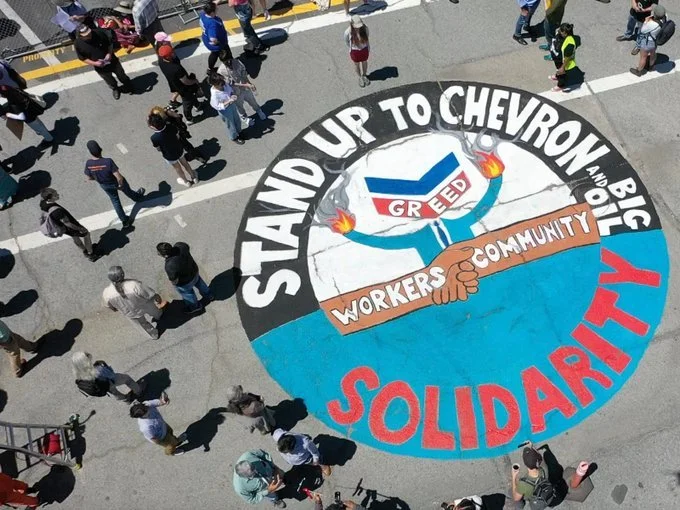 Inför Chevrons årsstämma deltog vi också i den nionde årliga Global Anti-Chevron Day den 21 maj 2022. Amazon Watch gick med i en mäktig demonstration utanför Chevrons notoriskt farliga raffinaderi Richmond i Kalifornien för att gå med i solidaritet med våra Richmond-grannar. Steven Donziger reste till Richmond för att ansluta sig till demonstranter, och evenemanget, som inkluderade många från det burmesisk-amerikanska samhället, inkluderade solidaritetsmeddelanden från drabbade samhällen i Ecuador, Nigeria och Australien. Återigen enades samhällen runt om i världen för att skicka ett meddelande till Chevrons ledning bara några dagar före dess aktieägarmöte: Ta ansvar för era brott och sluta tjäna på förstörelsen av samhällen och miljön.